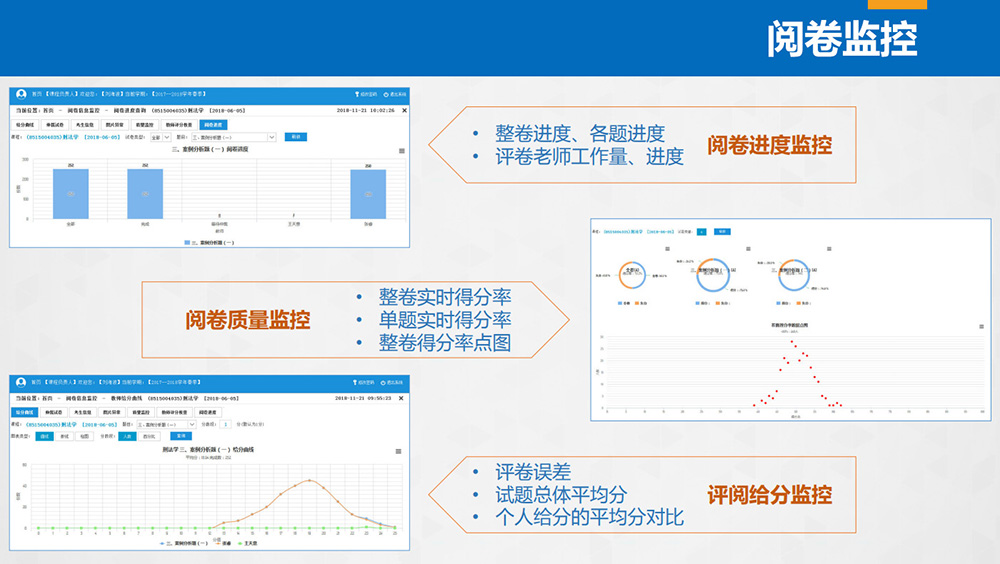 1. 閱卷進度監(jiān)控: 顯示試題數(shù)、閱卷教師信息、全部和個人閱卷任務數(shù)、已閱份數(shù)、未閱份數(shù)、仲裁份數(shù);顯示整卷進度、各題進度、評卷教師工作量及進度;